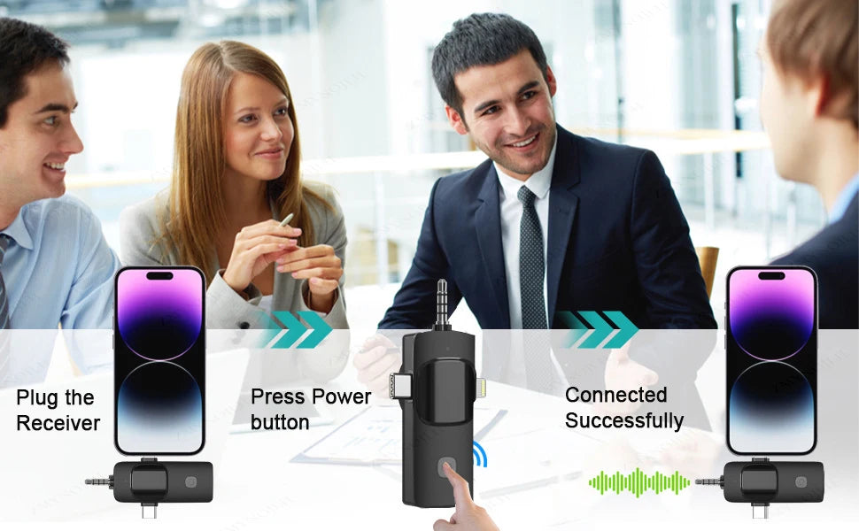 Microfon Wireless 4 în 1: Compatibil cu o gamă largă de dispozitive, inclusiv smartphone-uri (iPhone și Android), camere SLR și difuzoare. O soluție completă pentru toate nevoile tale de înregistrare și transmisie audio.